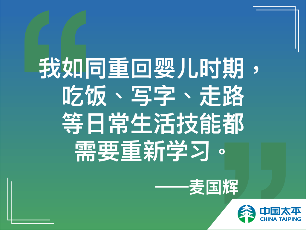 麦国辉先生是一位资深的保险精算师,也许是职业的关系,他深知凡事未雨绸缪的重要性。他对自己的健康尤为重视,除了保持健康的体魄之外,他还为自己投保了两份含重疾险的人寿保险计划。然而,天有不测风云,在他29岁时一场意外降临了,突发的出血性中风,紧急脑手术治疗,突如其来的疾病,让他的生活发生了翻天覆地的变化。