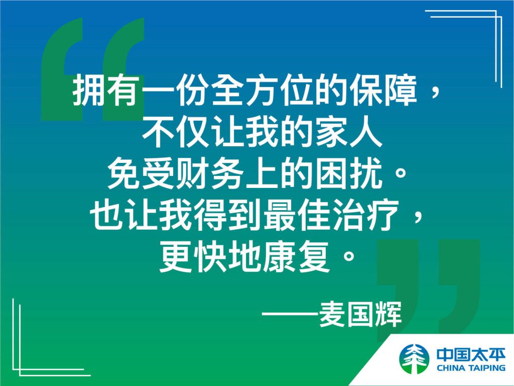 人的一生有时候必须经历过痛苦,才能体会到生存的快乐。就像麦国辉先生一样,现在他已从疾病中完全康复,并重返了他热爱的马拉松赛场。他也在闲暇时间里当一名志愿者,尽自己力所能及的力量去服务社会。虽然这次疾病让他无法再投保,但也正是因为这样,他懂得了更加爱惜自己,更加清楚地知道保持最佳的身心健康和良好的身体状态很重要,而提早为自己投保更重要,否则一旦疾病降临到你身上,就为时已晚了。