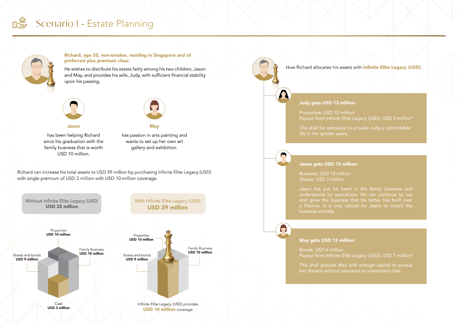 Take Richard’s situation, for example. Based on the scenario above, Richard can increase his total assets to USD 39 million by purchasing Infinite Elite Legacy (USD) with a single premium of USD 3 million for USD 10 million coverage.